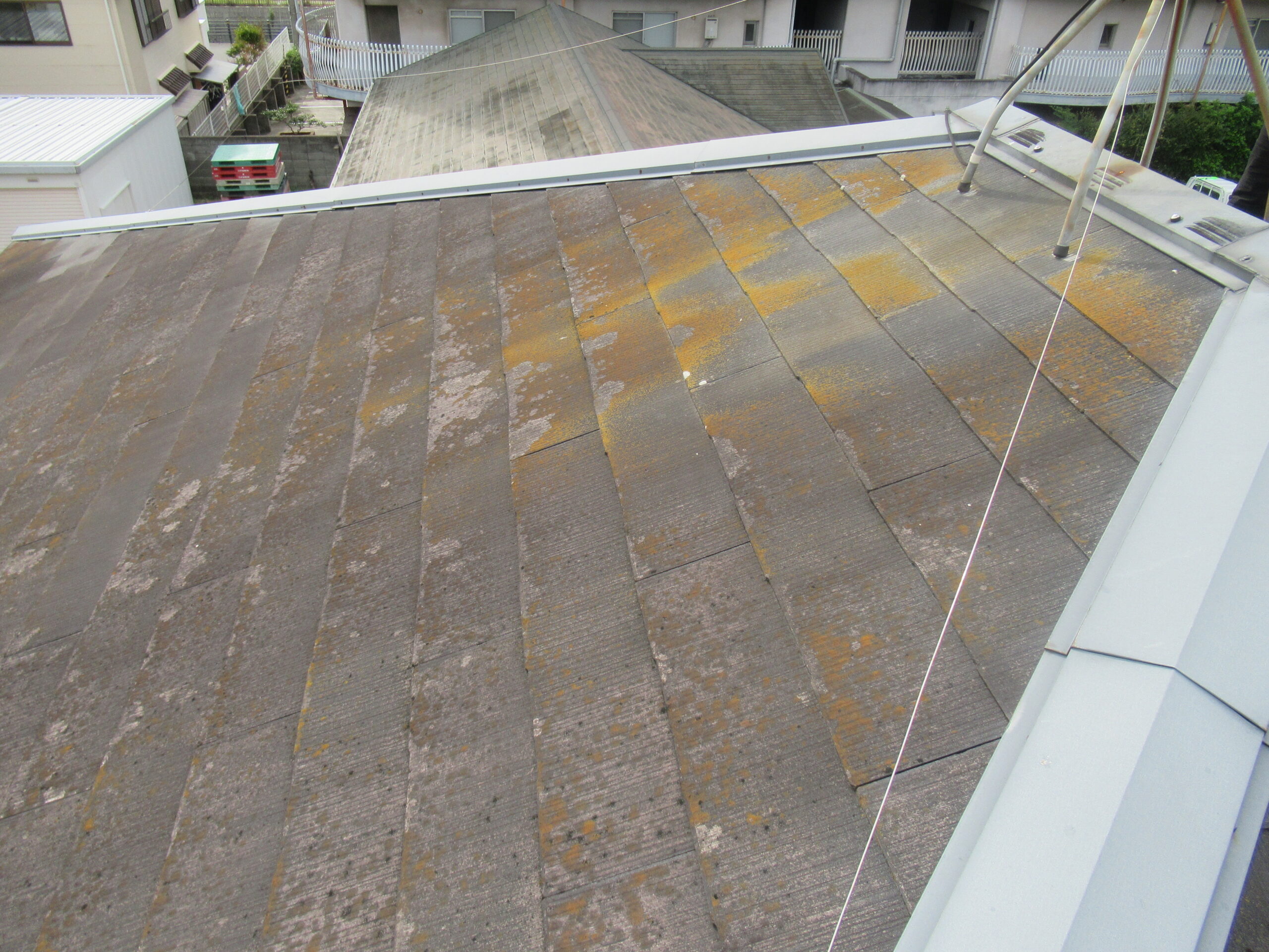 全体的に劣化の進行が見受けられました。コケの状態が見受けられましたので、高圧洗浄できれいに落とします。