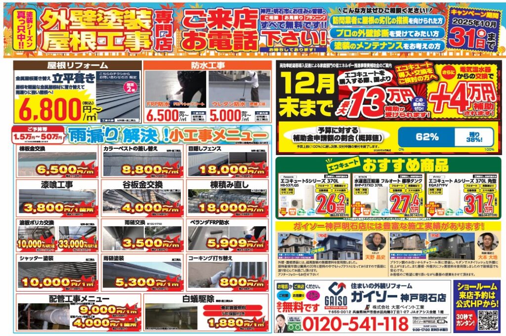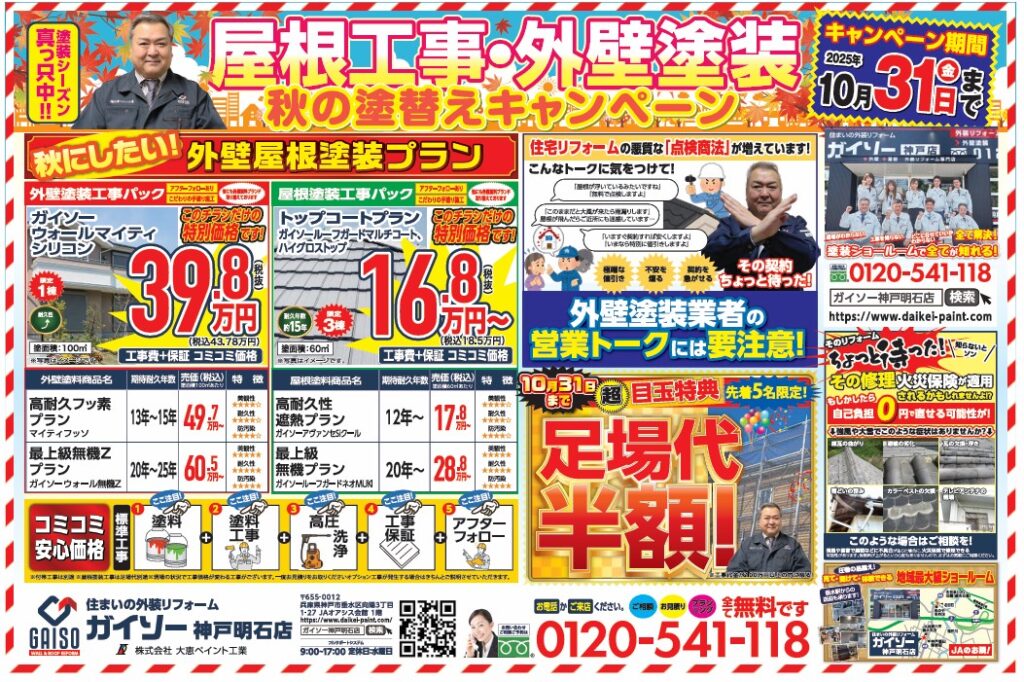 今回ご紹介した、ガイソー神戸明石店の秋の塗替えキャンペーンは10月31日までとなっております。