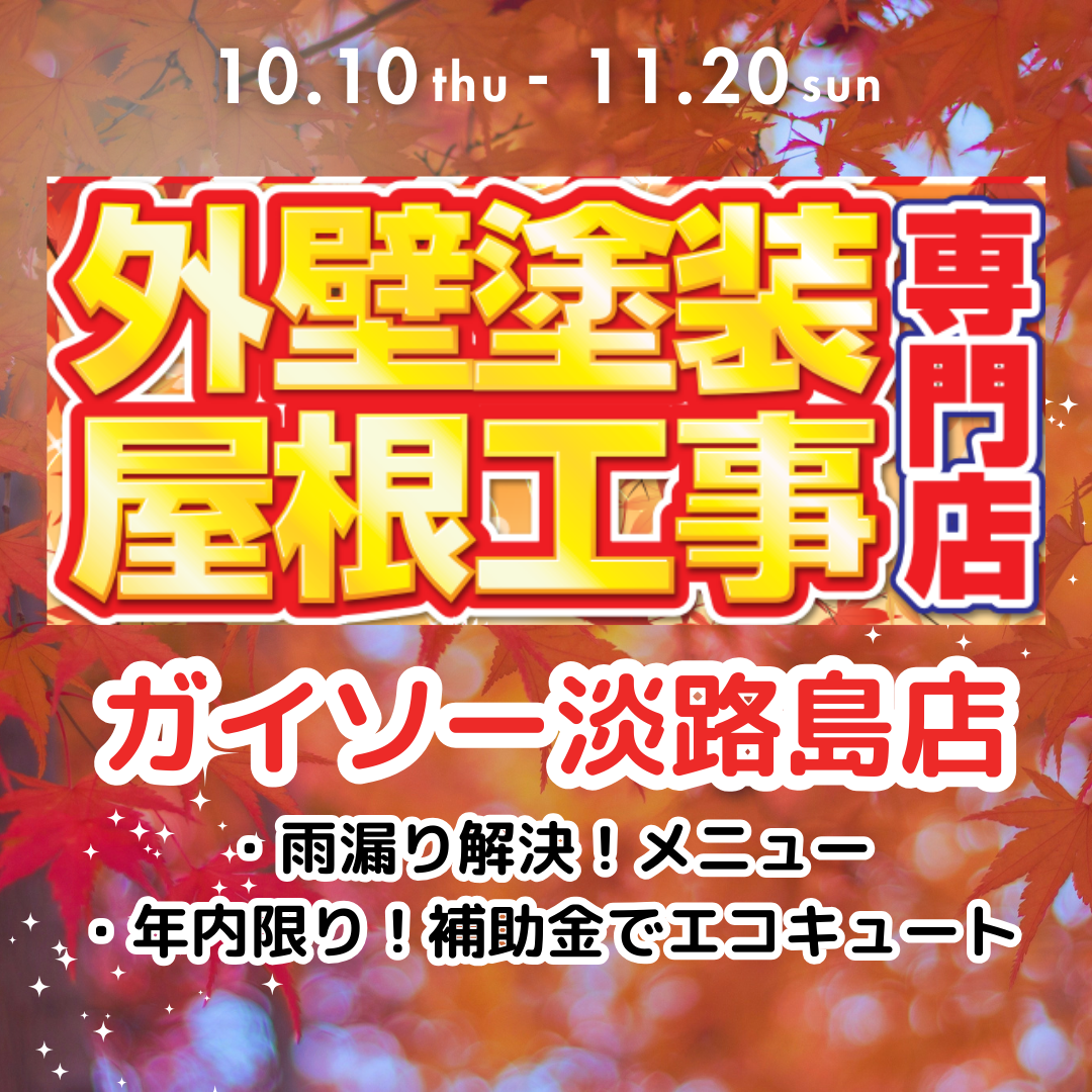 2025年10月 神戸明石店「秋の塗替えキャンペーン」のご紹介です! 1.目玉特典!足場代半額致します! 先着5名! 外壁塗装・屋根塗装をする上で、ほぼ必ず必要となってくるのが足場代です。 足場設置は、安全にかつ綺麗に作業を行う上では欠かせない工程です。 が!金額面でも少し気になるところ・・・ではないでしょうか。 そこで、今回の秋の塗装キャンぺ―ンの目玉として、足場代半額の特典をご用意致しました! 外壁塗装・屋根塗装をご検討されておりましたら、是非この機会にこのお得な特典をご利用下さい! この足場代半額特典は、WEBキャンペーンとの連動キャンペーンとなっております! 先着5名様と限られておりますのでお早めにご検討下さい♪ 2.秋は塗装のベストシーズン!お得な外壁屋根塗装プラン! オススメ!秋にしたい!外壁塗装パック 限定1棟!シリコンパック 外壁塗装で耐久性を高め、価格も抑えたい方にはこちらがオススメ!工事費コミコミ価格で39.8万円(税抜)~※塗面積100㎡ となっております。 限定1棟となっておりますのでお早めにご検討下さい。 高耐久フッ素プラン ある程度耐候性も欲しいが価格も抑えたい。そんな方には高耐久のフッ素プランがオススメです。 期待耐候年数は約15年!価格は49.7万円(税込)~※塗面積100㎡ となっております。 最上級無機プラン 最後の塗装にしたい、1回の塗装で長く持たせたい!そんな方には断然無機プランがオススメです。超高耐久の無機成分配合で、お住いを長期に渡りお守りいたします。価格は他に比べ上がりますが、長期でみれば高コスパ! 期待耐候年数は約25年!価格は60.5万円(税込)~※塗面積100㎡ となっております。 オススメ!秋にしたい!屋根塗装パック 人気!トップコートプラン ガイソー神戸明石店でも人気のプランです。様々な屋根材に対応でき、省工程が可能で経済的なのもポイント。多くのお客様にご満足頂いております。 価格は16.8万円(税抜)~※塗面積60㎡ となっております。 暑い夏に備えよう!高耐久遮熱プラン 昨今の温暖化&高気温に、屋根塗装で備えませんか?近年お問合せが増えてきているのが遮熱塗装です。最大80%太陽光を反射・散乱させ、屋根の温度上昇を抑制します。 こちらは屋根だけでなく、外壁にも塗装可能です! 価格は17.8万円(税込)~※塗面積60㎡ となっております。 最上級無機プラン お住いで一番雨風や太陽光の影響を受けるのが屋根ではないでしょうか。 その屋根を、最上級の無機塗装で守りましょう!ガイソー神戸明石店でまずオススメしたい屋根塗装がガイソールーフガードネオMUKIを使用した無機プランです。 価格は28.8万円(税込)~※塗面積60㎡ となっております。 3.キャンペーン期間は10月31日まで! 今回ご紹介した、ガイソー神戸明石店の秋の塗替えキャンペーンは10月31日までとなっております。 相見積も大歓迎ですので、お気軽にお問合せ下さい! お電話はこちらから