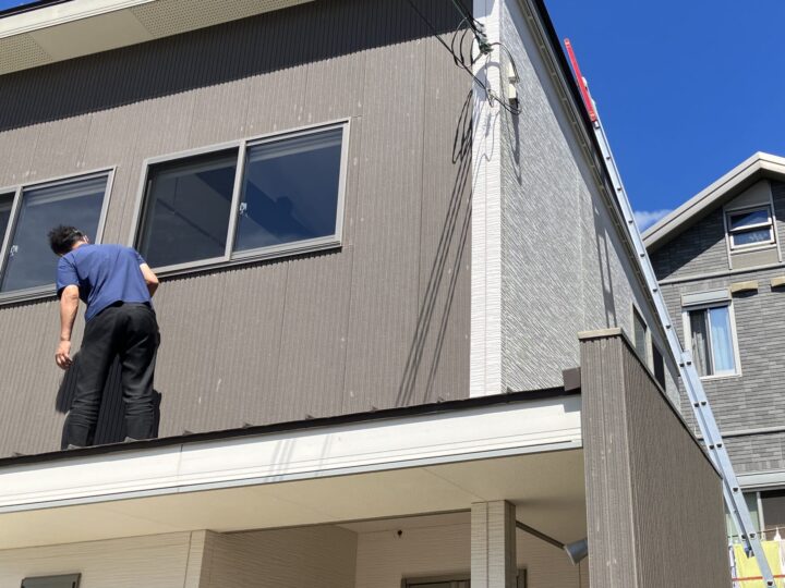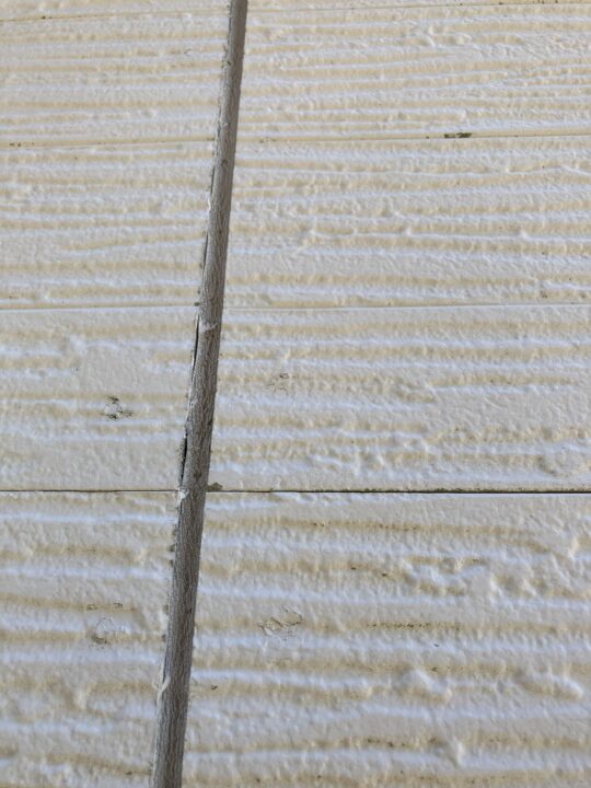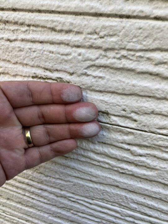 外壁を指で触ると白い粉が付くチョーキング現象が見られました。防水効果が低下している様です。 -
