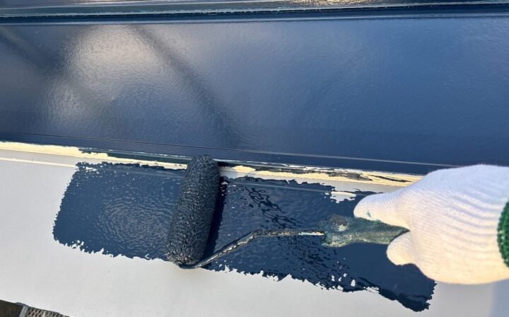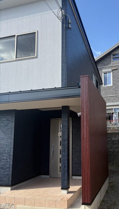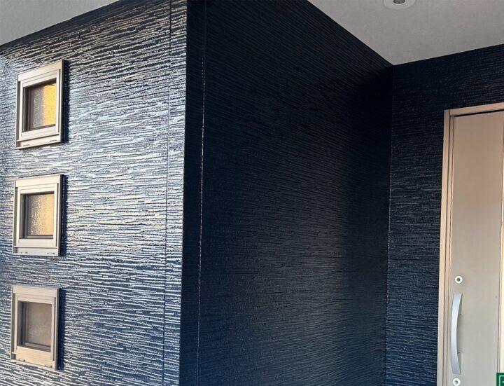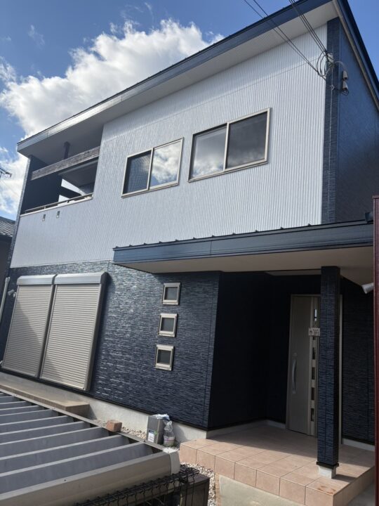 外壁塗装には高耐久のフッ素塗料をお選び頂きました。人気色のひとつ、ネイビーで塗装しました。 -